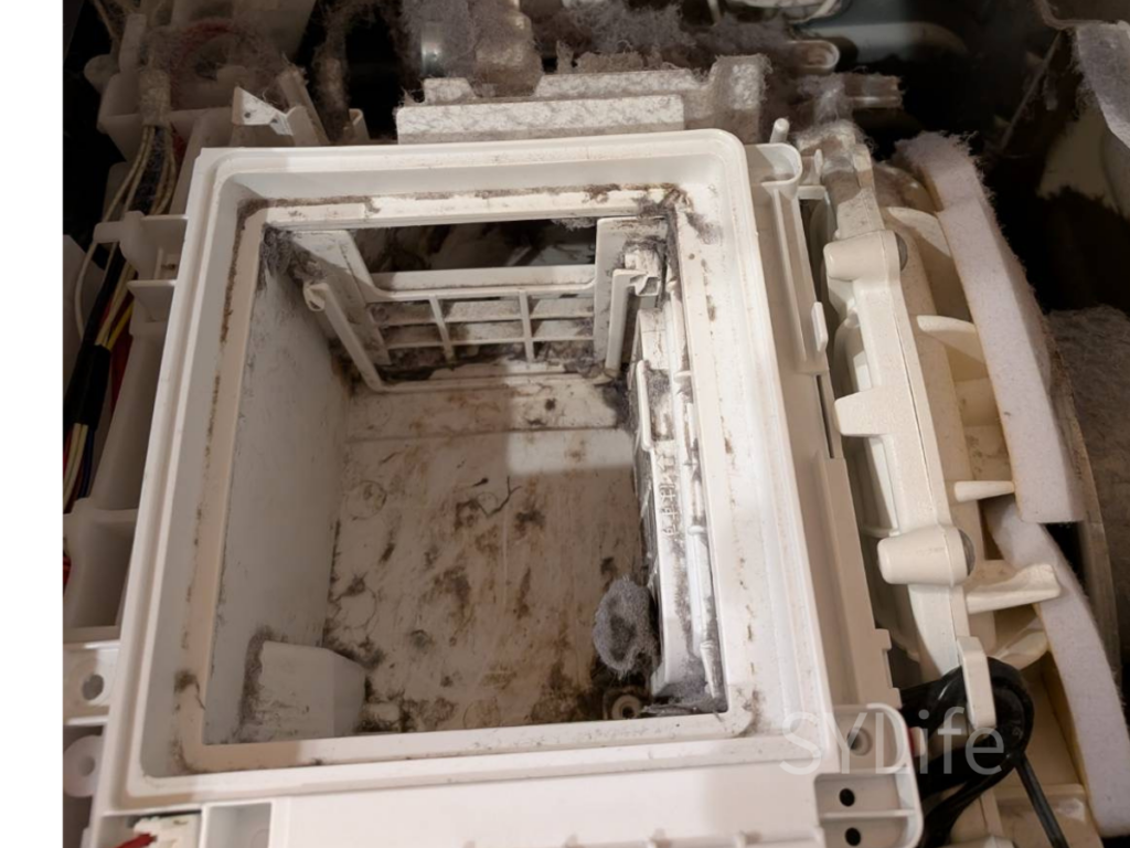 乾燥フィルター周りも全体的にホコリが詰まっている状態。乾燥がうまくいかなくなっているためかカビてしまっている。